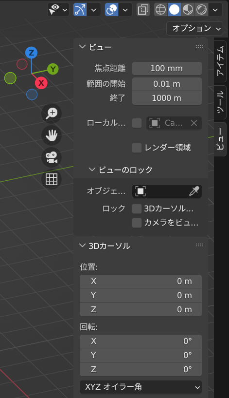 ビューポートの右上「オプション」の下にある「<」をクリックすると「アイテム」「ツール」「ビュー」の3メニューが表示されます。そのうち、「ビュー」をクリックすると、焦点距離を設定する欄が表示されます。